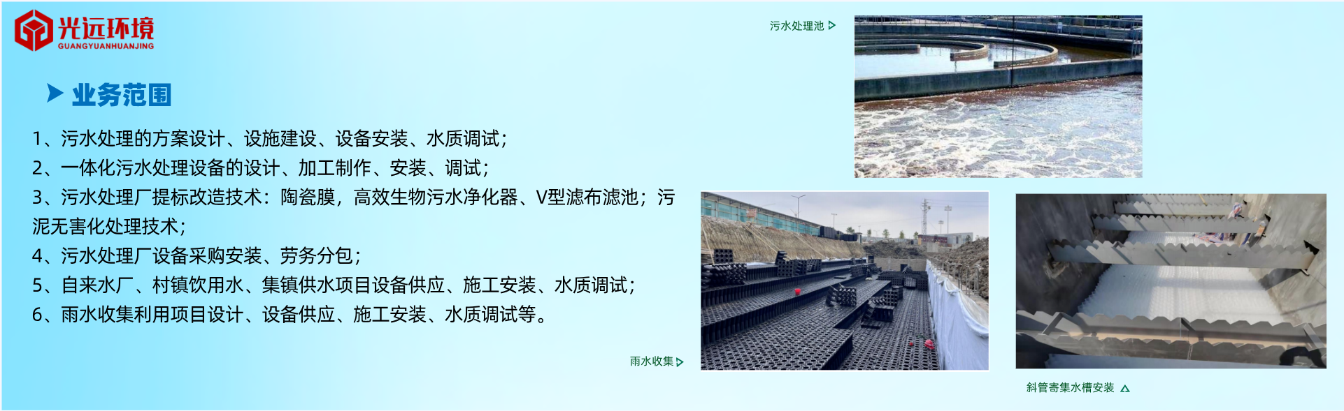 公司致力于污水處理事業(yè)的研究發(fā)展,主要從事:污水處理場、自來水廠、污水處理站、村鎮(zhèn)飲用水、集鎮(zhèn)供水等項目的設(shè)計、新建、提標(biāo)改造和運行維護(hù)及相關(guān)工作。